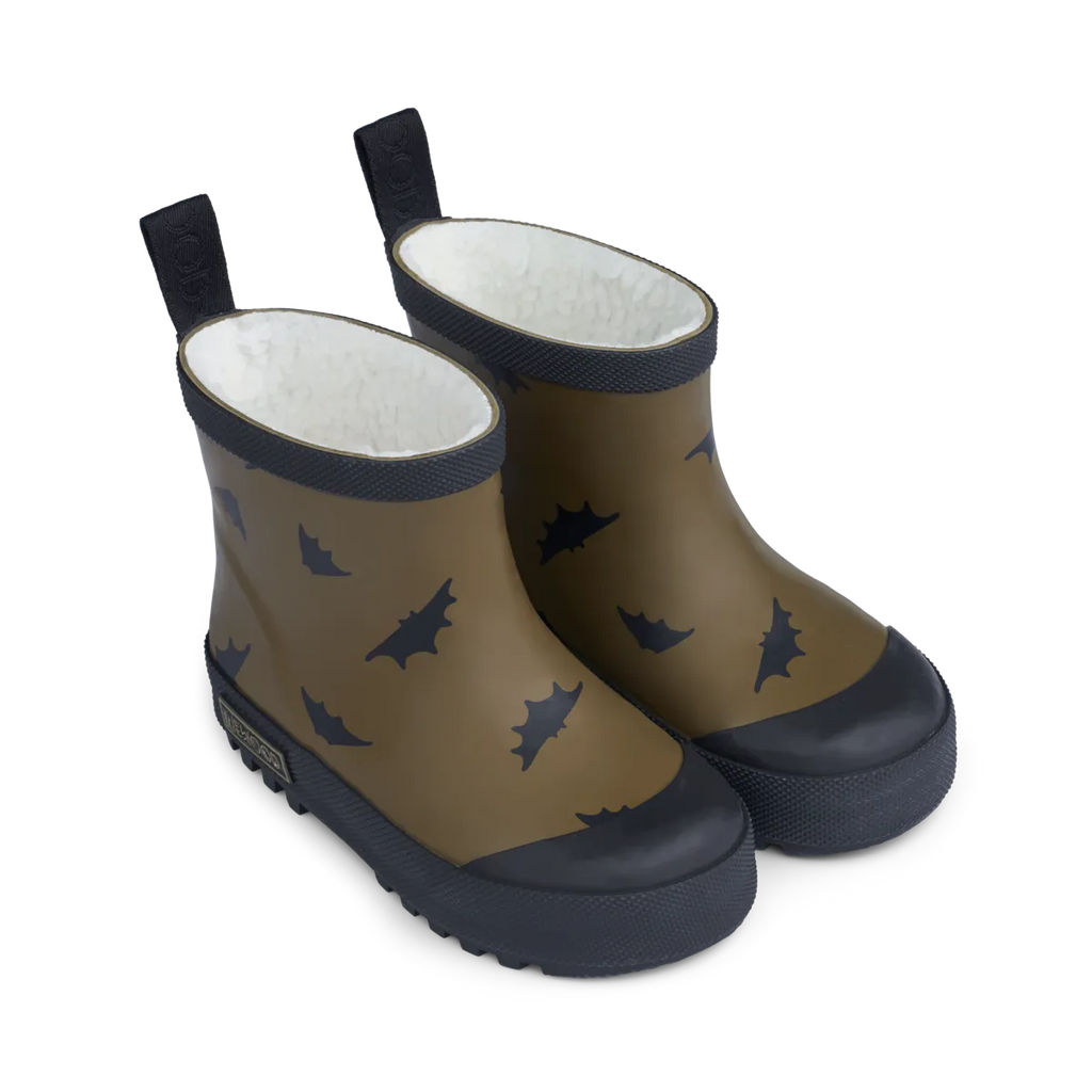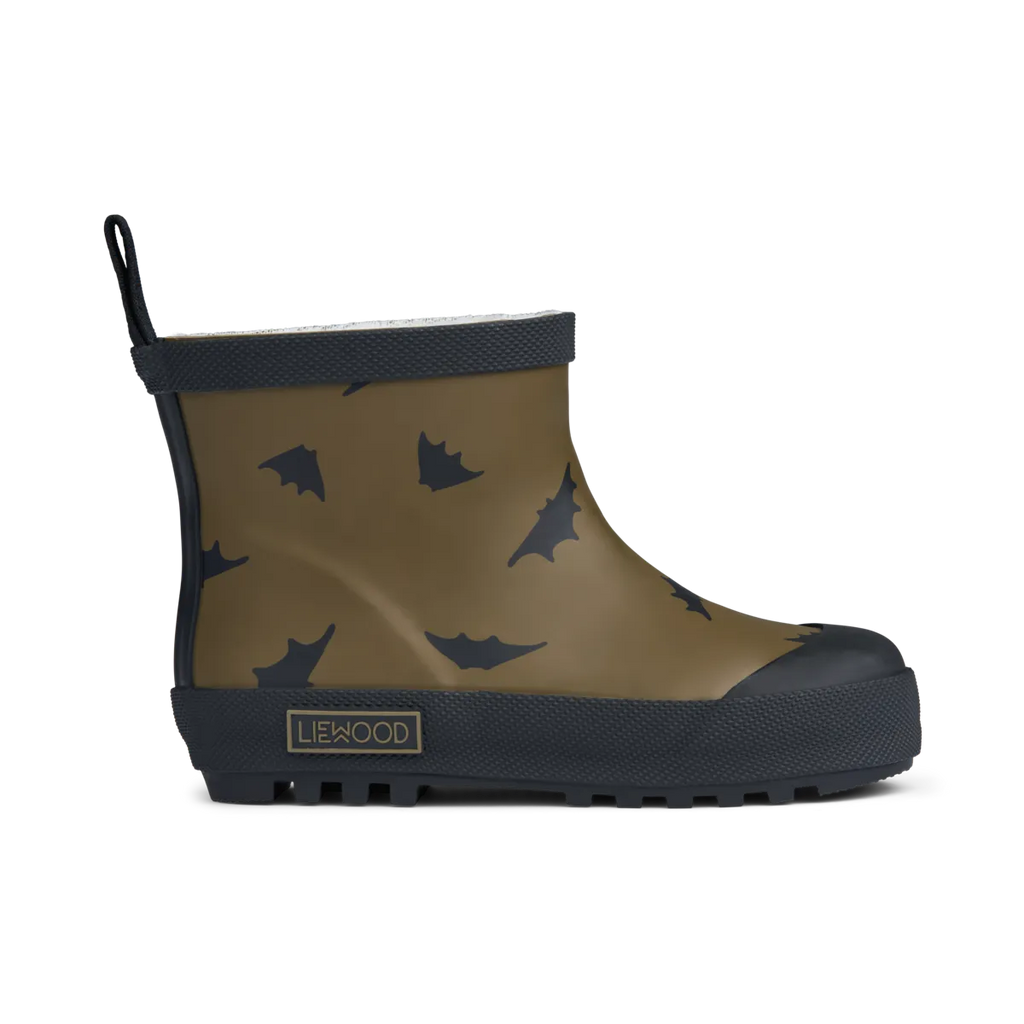 Stoere regenlaarsjes van het merk Liewood met vleermuizen print.
