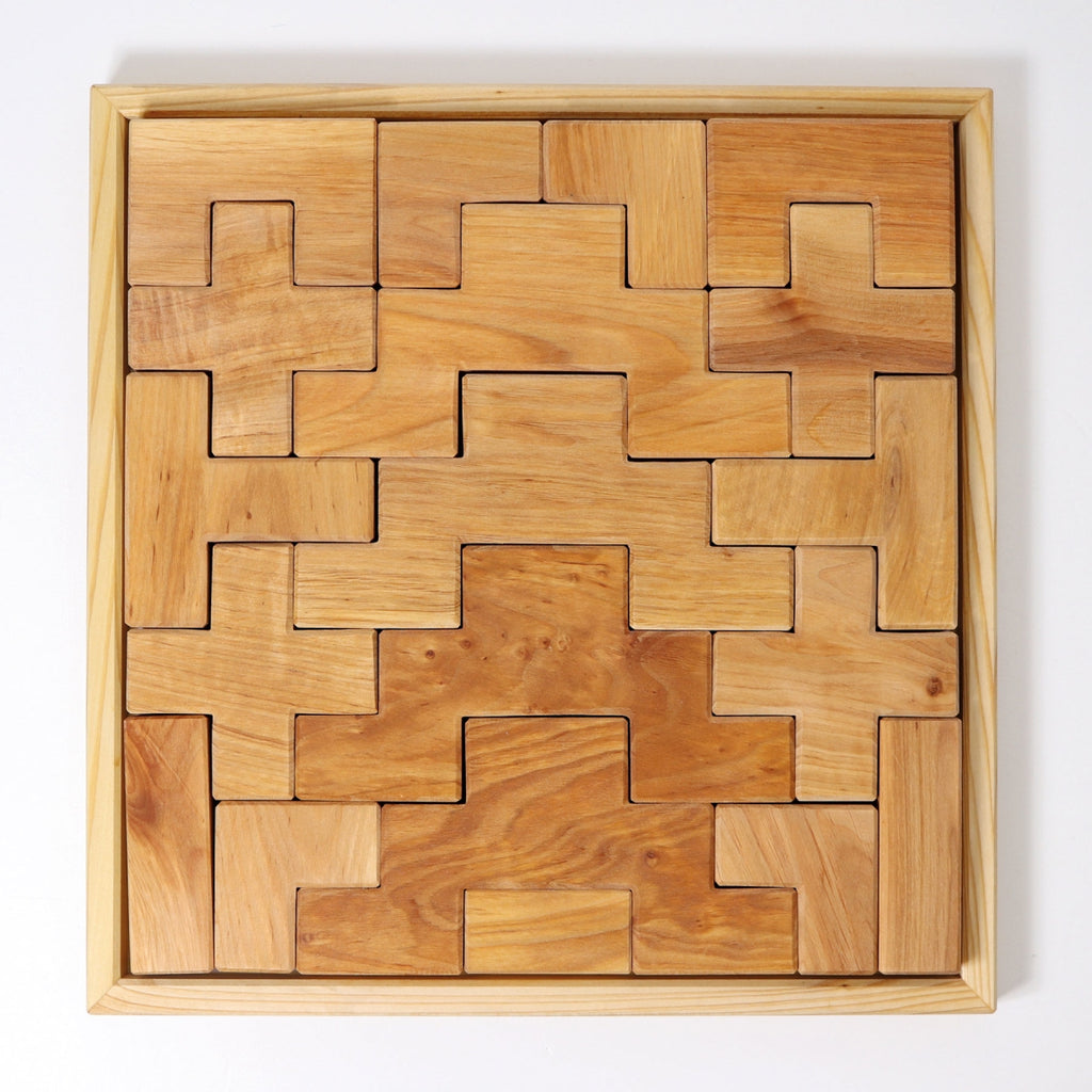Deze bouwset bestaat uit 19 trapvormige houten blokken van verschillende formaten. Hiermee kan je fantastische constructies kan bedenken. De trapvormen doen denken aan kastelen met kantelen en middeleeuwse steden. Dit eenvoudige speelgoed is superveelzijdig: je kan er tientallen patronen mee bedenken door de figuren op allerhande manieren te stapelen en in elkaar te puzzelen. Dit bevordert het ruimtelijk inzicht, maar is vooral ook heel leuk om te doen. Dat het resultaat er altijd geweldig uitziet, komt het spelplezier alleen maar ten goede!