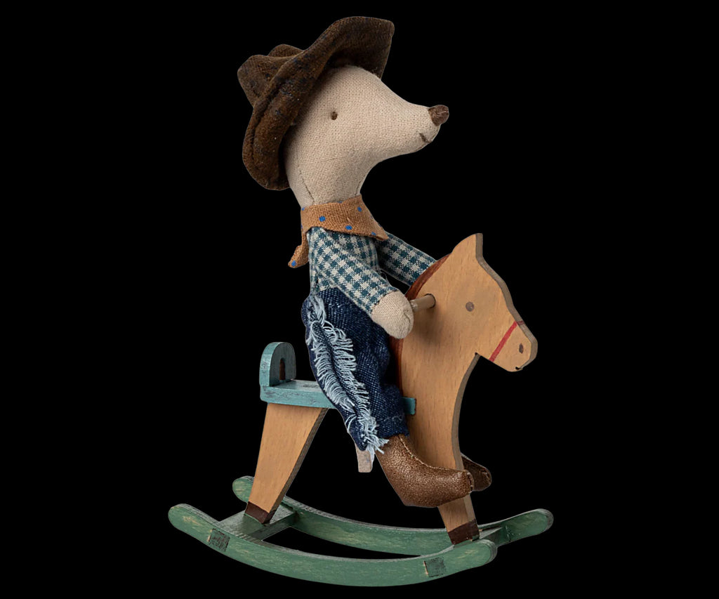Een fantastische set voor urenlang speelplezier. Een cowboymuis met magneten in zijn handen, gekleed in een spijkerbroek, een sjaal en een cowboyhoed, rijdt op zijn hobbelpaard. Let op het kleine staartgat op het paard – een detail voor de oplettende consument.