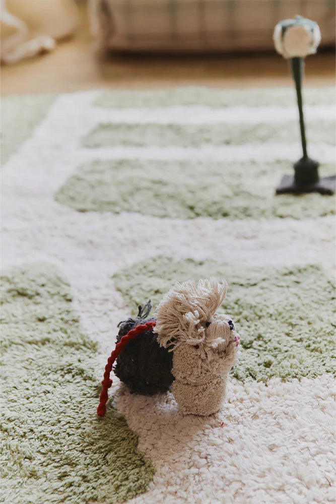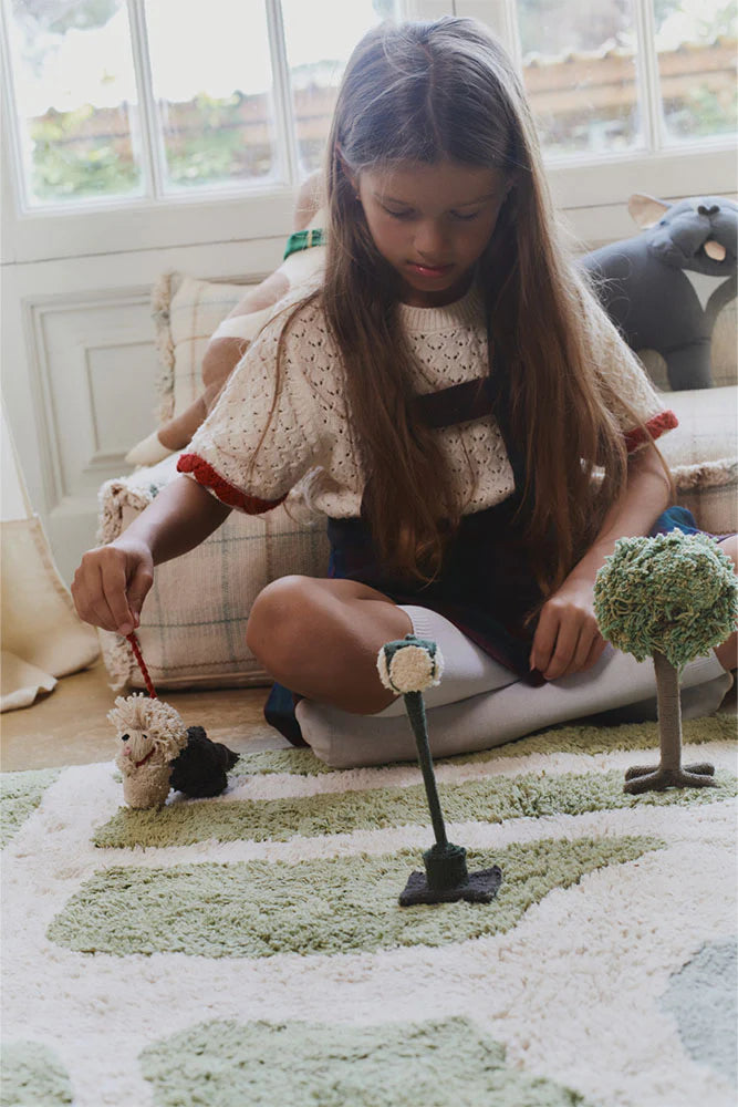 Een wandeling door Hyde Park! Rechthoekig katoenen speelkleed, geïnspireerd op het iconische Hyde Park in Londen. Inclusief vijf handgemaakte accessoires: een boom, lantaarnpaal, brug, hond en zwaan – allemaal opgeborgen in een praktische katoenen tas. Elk item is zorgvuldig met de hand gemaakt met materialen zoals katoenen koorden, bamboe en met de hand afgewerkte details om het park tot leven te brengen.