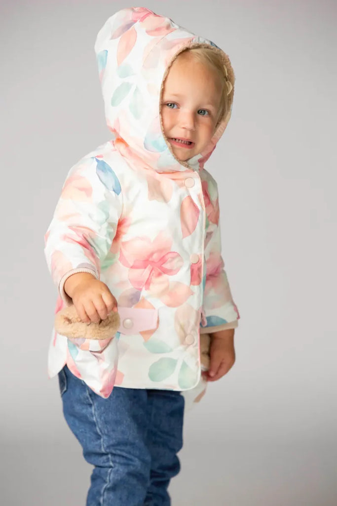 De schattige jas is afgewerkt met zachte teddyfleece en corduroy details en heeft een dubbele sluiting met rits en knopen.