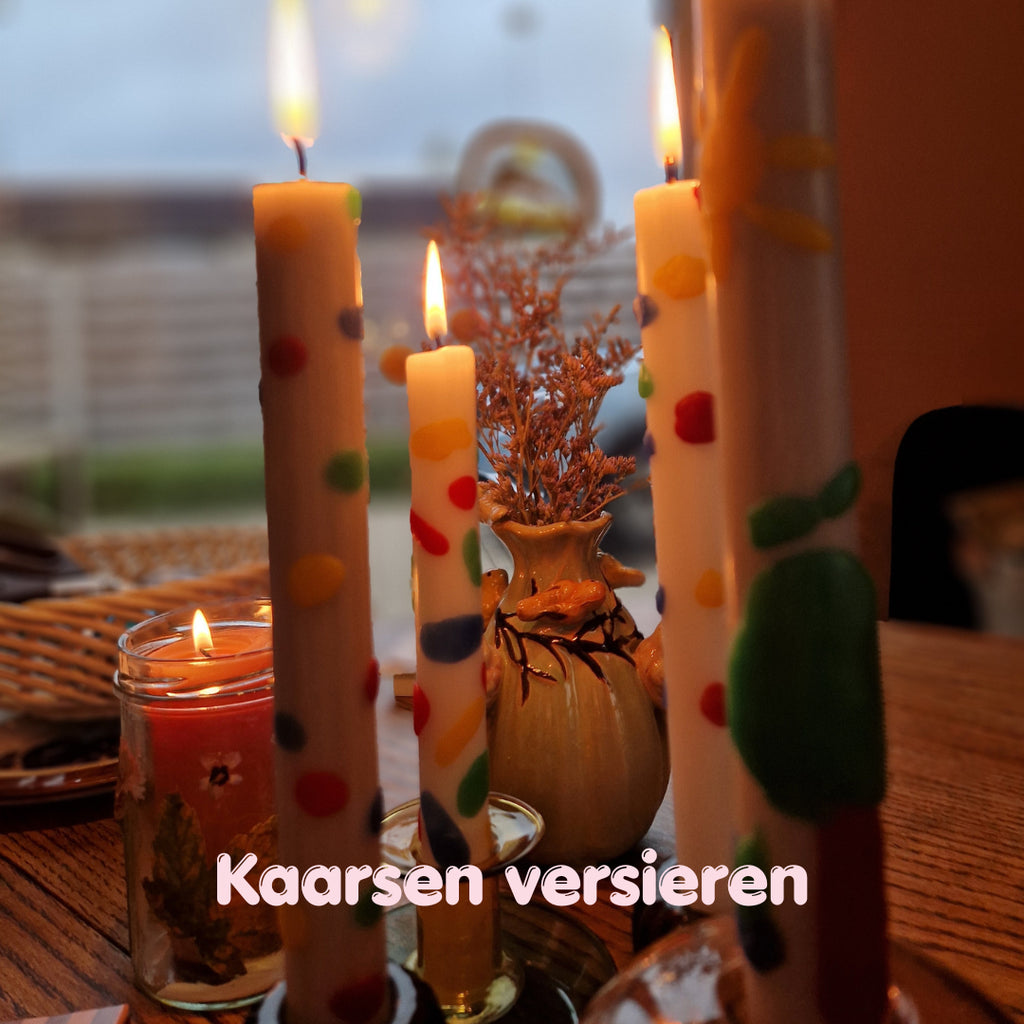 Tijdens deze workshop kan jouw kiddo onder jouw begeleiding deze activiteit uitvoeren. Ik help je graag met een introductie en ben ter beschikking voor hulp. Een rustgevende activiteit waarbij we door middel van stukjes bijenwas een kaars gaan versieren naar eigen wens. Met klei maken we een kaarsenhouder zodat jouw kaars meteen een plekje kan krijgen bij thuiskomst.