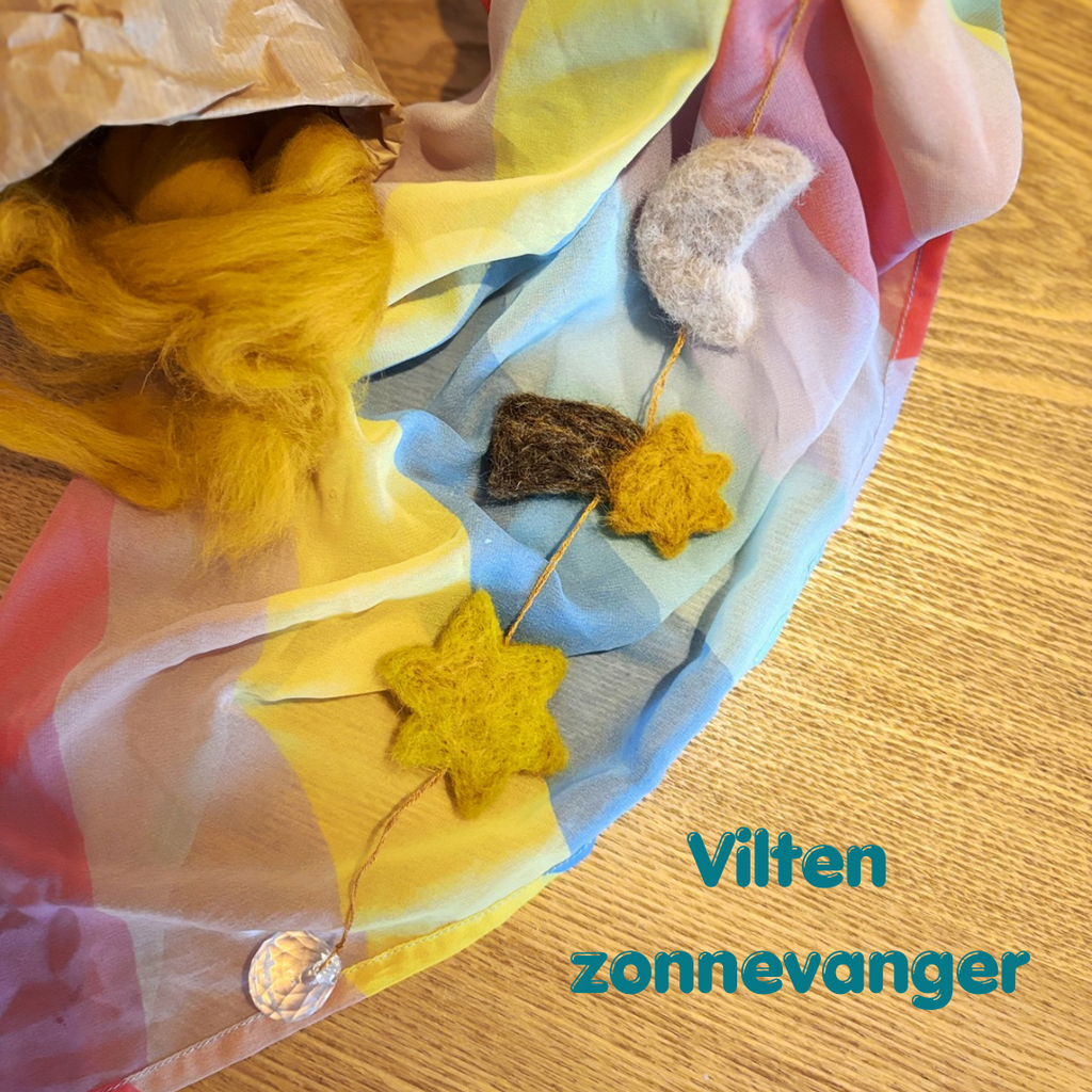Tijdens deze workshop kan jouw kiddo onder jouw begeleiding deze activiteit uitvoeren. Ik help je graag met een introductie en ben ter beschikking voor hulp. Met vormpjes gaan we prikvilten. Een rustgevende techniek waarbij we van losse vilt een hanger maken. Onderaan de hanger komt een zonnevanger om elk zonnestraaltje nog meer te laten schijnen.