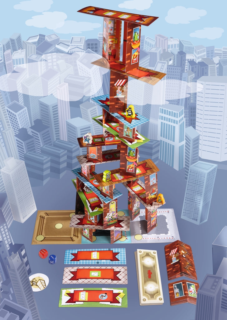 hino Hero en zijn superheldenvrienden beleven allerlei avonturen op de van kaarten gebouwde wolkenkrabber. Maar pas op: hoe meer kaarten er worden gebruikt om muren en verdiepingen te bouwen, hoe hoger en wankeler de wolkenkrabber wordt. Met slimme dobbelsteenworpen kun je je superheld hoog de lucht in tillen en je positie verdedigen in dobbelsteengevechten tegen andere spelers... ware het niet voor de Spider-Monkeys, die er altijd op uit zijn om de wolkenkrabber te laten wankelen.