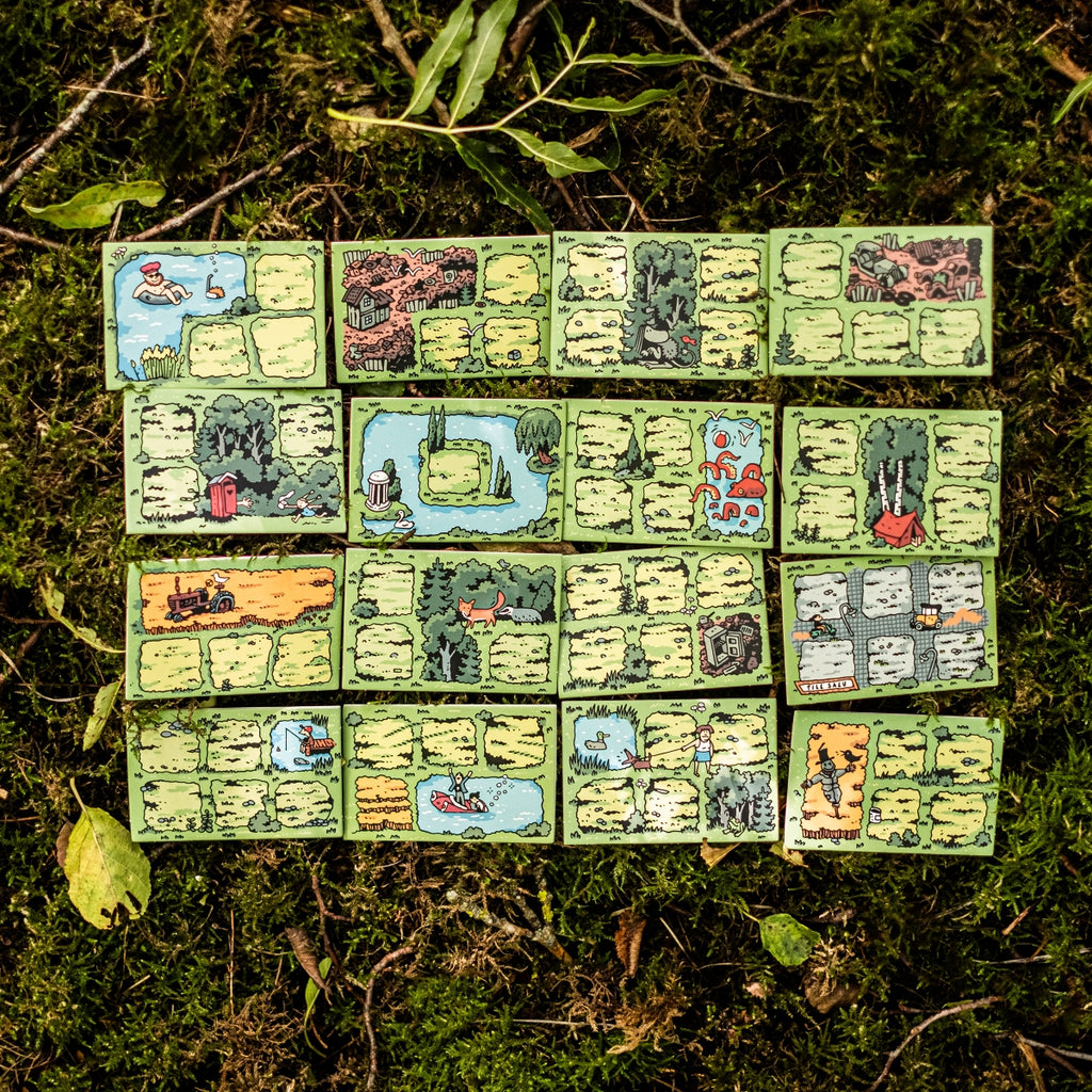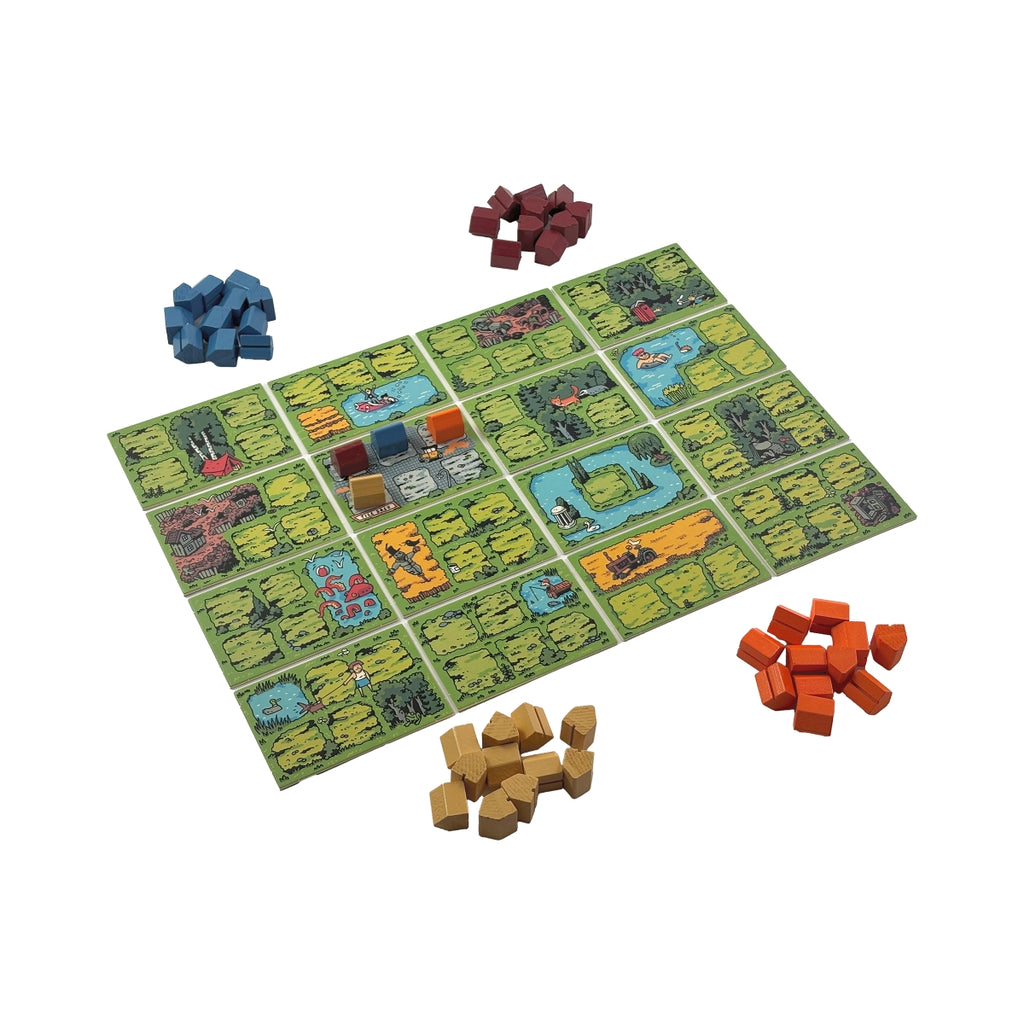Inhoud: 48 hutten (12 van elke kleur) in een stoffen zak, 16 tegels (waaronder 1 stad en 1 eiland).