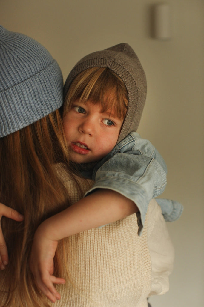 Naadloze bivakmuts om vrij te spelen en warm te blijven tijdens koudere dagen. De rib rond de nek zorgt voor warmte zonder dat je een sjaal nodig hebt. De top is een beetje zichtbaar tijdens het dragen.