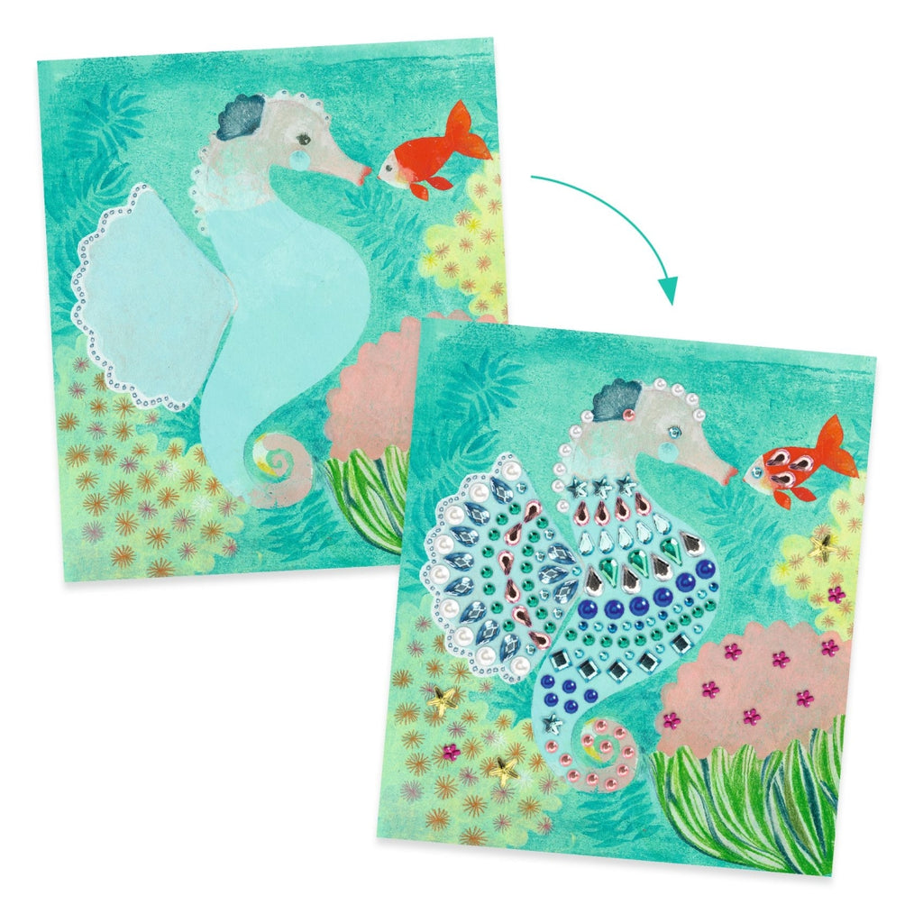 Met deze set kun je vier geïllustreerde kaarten versieren met een veelvoud aan mini facetgeslepen diamanten in verschillende vormen en kleuren. Elk velletje strass-steentjes komt overeen met een te versieren afbeelding. Door de stapsgewijze instructies te volgen, voegt het kind geleidelijk diepte en glans toe aan de afbeeldingen en versterkt het de geïllustreerde wezens.