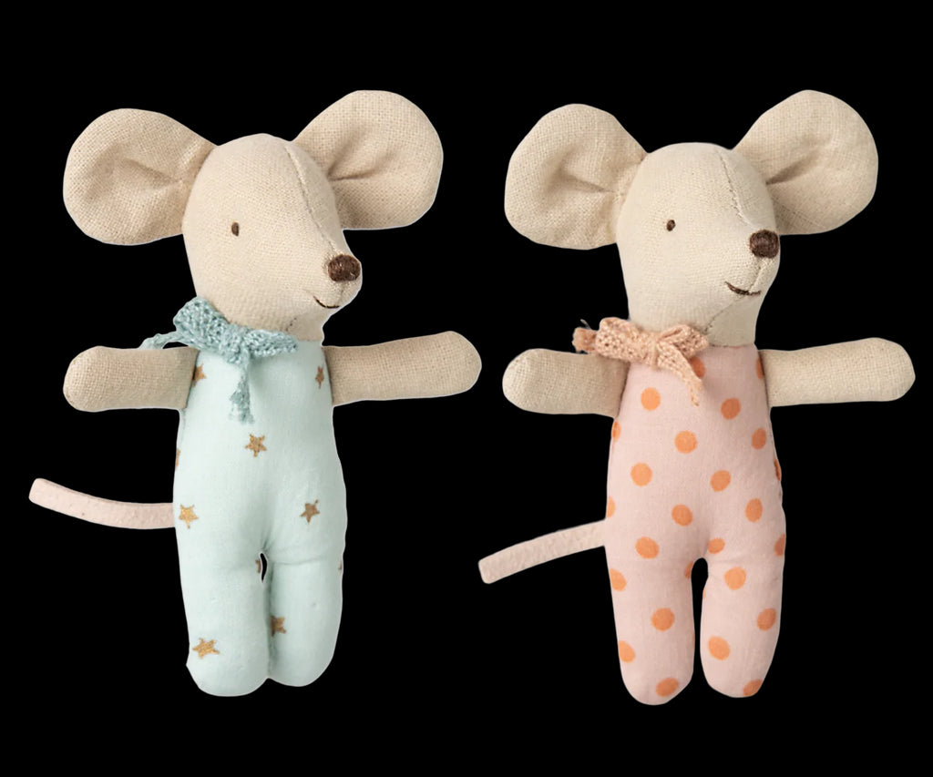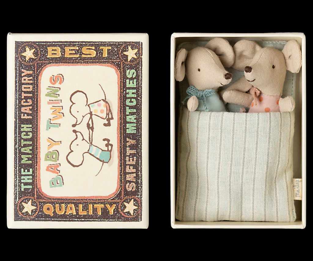 Een klassiek Maileg-artikel. Deze baby-tweelingmuisjes slapen veilig naast elkaar in hun slaapzak, verstopt in het luciferdoosje. De muisjes passen op alle accessoires in de maat babymuis.