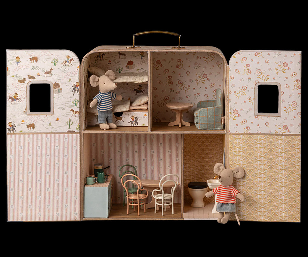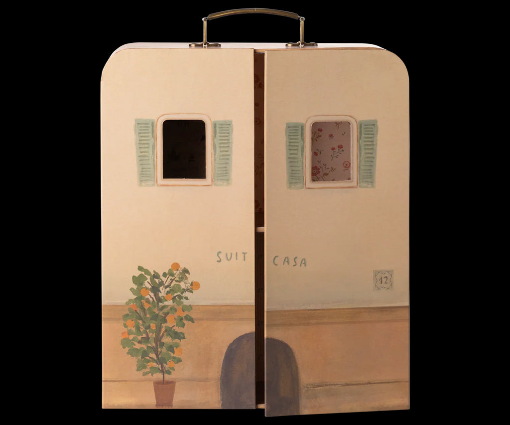 Welkom bij SuitCasa - een klein, draagbaar huisje. Het is geschikt voor de grootte van: Broertje en zusje muisjes. Twee sets zacht beddengoed voor je vriendjes zijn inbegrepen, maar je kunt ook diverse andere kleine meubels kopen om het huisje mee te decoreren.