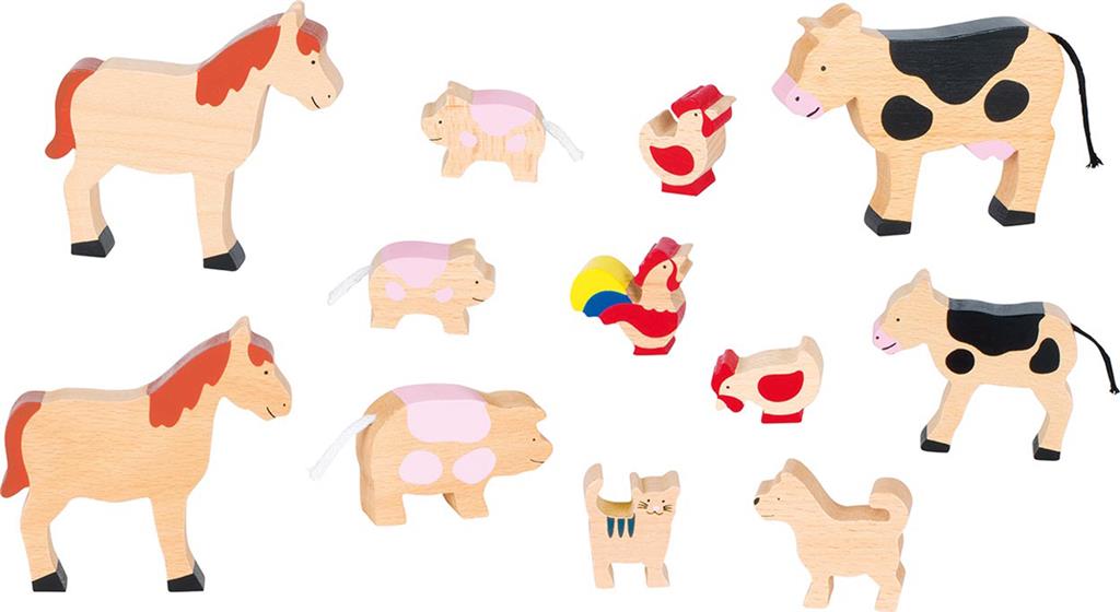 Mooie set houten boerderijdieren van Goki. Bevat 12 diertjes waaronder koeien, varkens, paarden, kippen, poes en hond.
