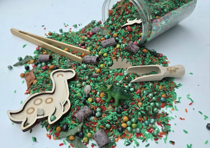 De kikkererwten en Pasta worden geverfd met gekeurde niet giftige acrylverf. De speelrijst word gekleurd met azijn en voedselkleurstof.