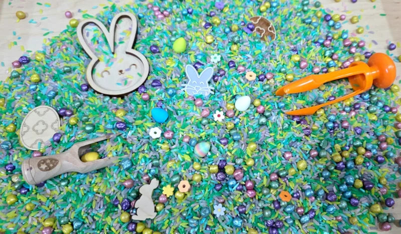 SensoryMix zoals  rijst, kikkererwten en gekleurde pasta´s.