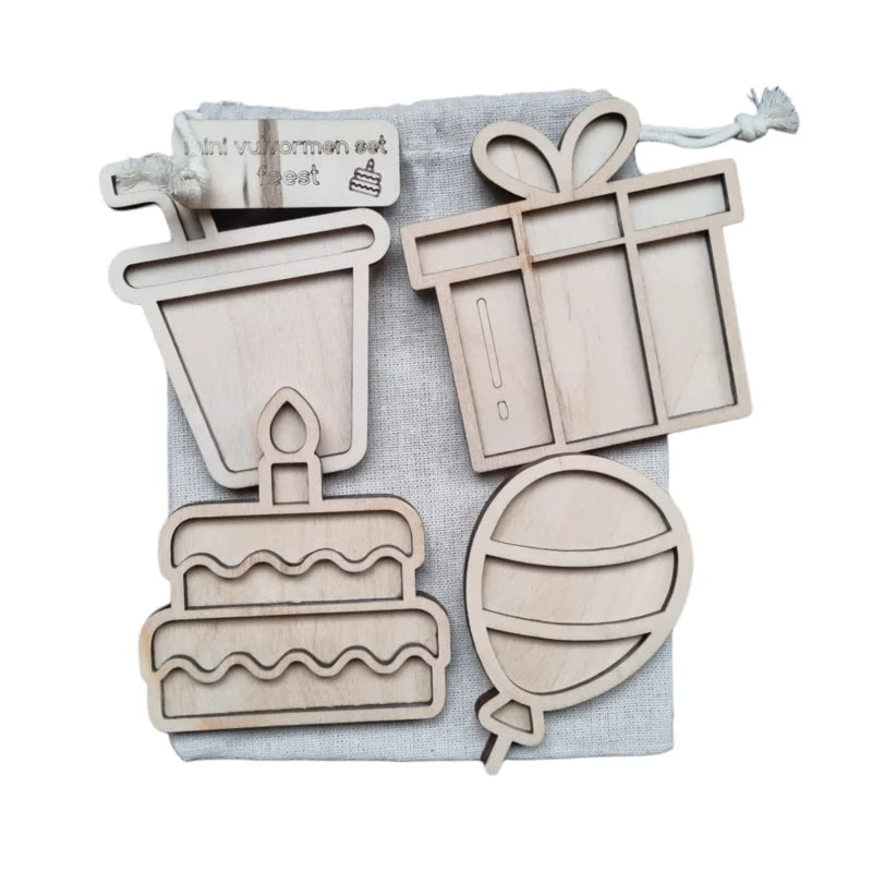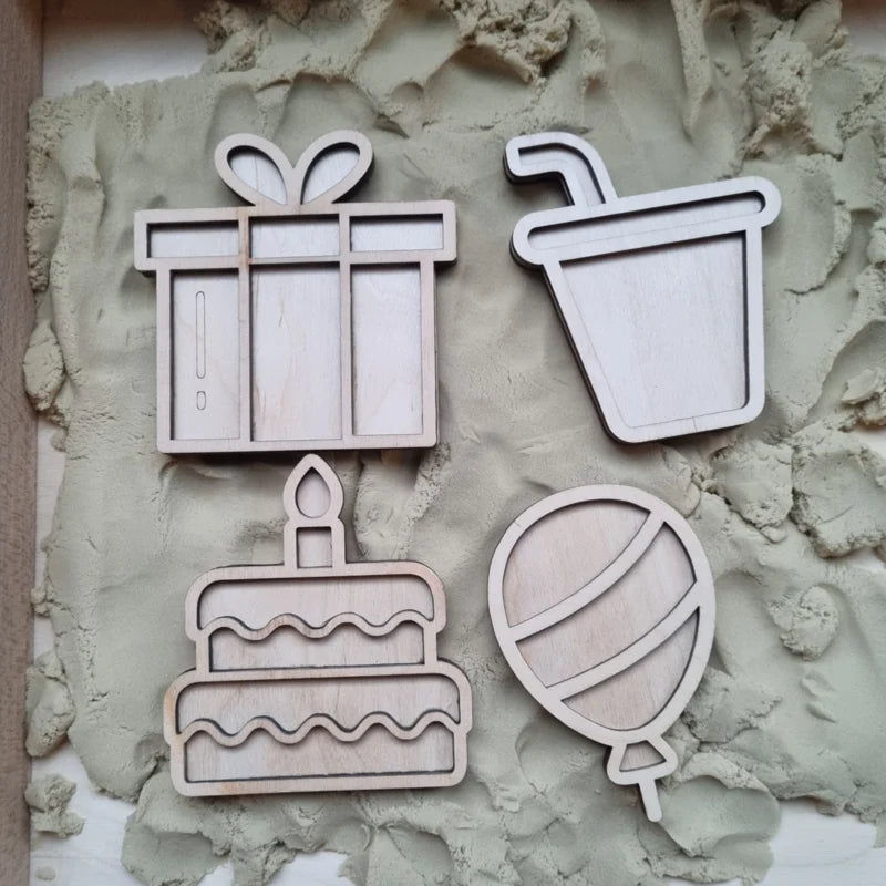 Vulvorm of speeltray in het thema feest. Een ballon, cadeau, limonadebeker en taartje. Perfect te vullen met droge items zoals speelrijst / speelparels.  In een lekker klein en handig formaatje.
