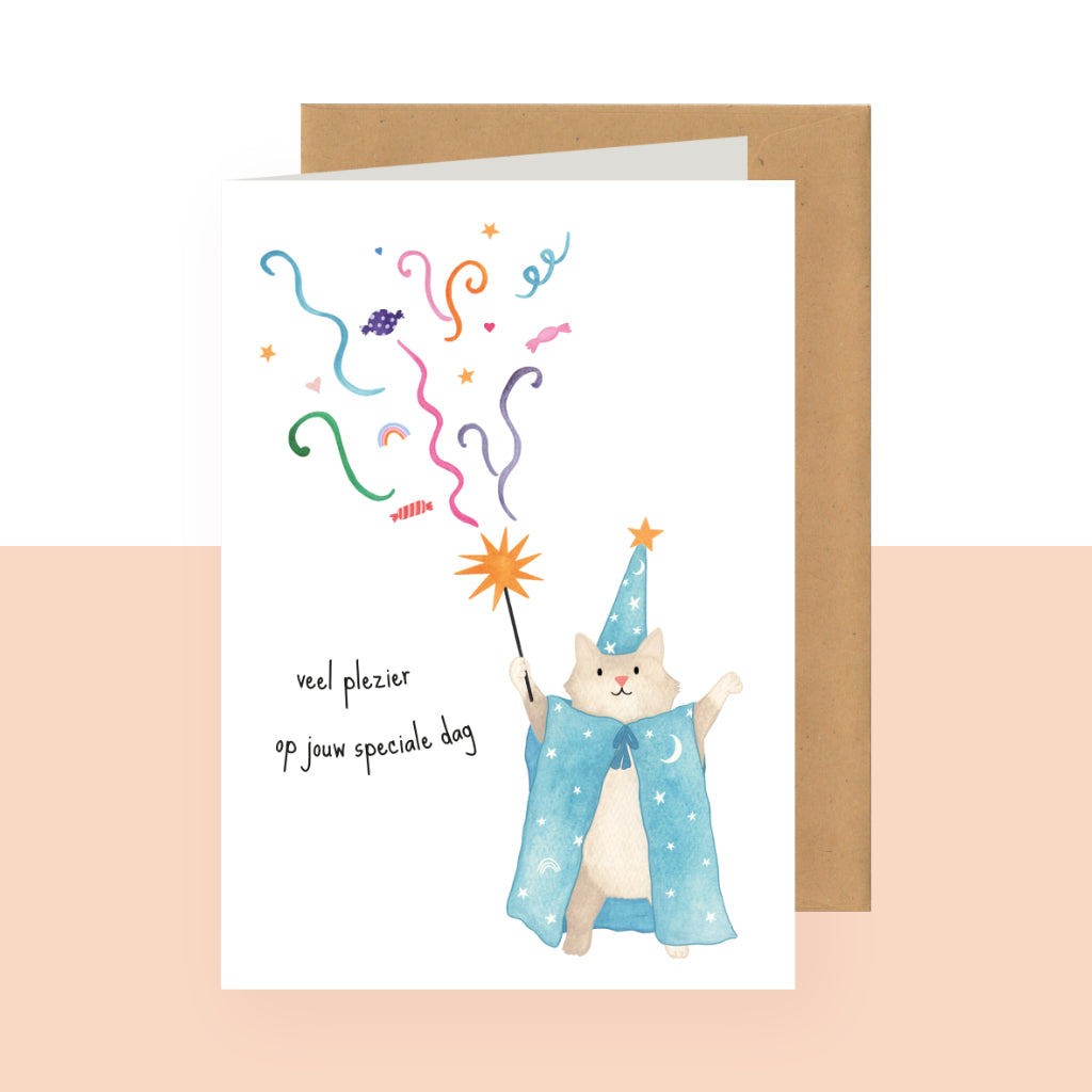 Een kat die wel zin heeft in een feestje! Deze feestkaart tovert plezier, slingers én een glimlach tevoorschijn. Met de boodschap “veel plezier op jouw speciale dag” is dit kaartje perfect voor verjaardagen, communie- en lentefeestjes of een zomaar-kaartje voor iemand die wat extra magie verdient.