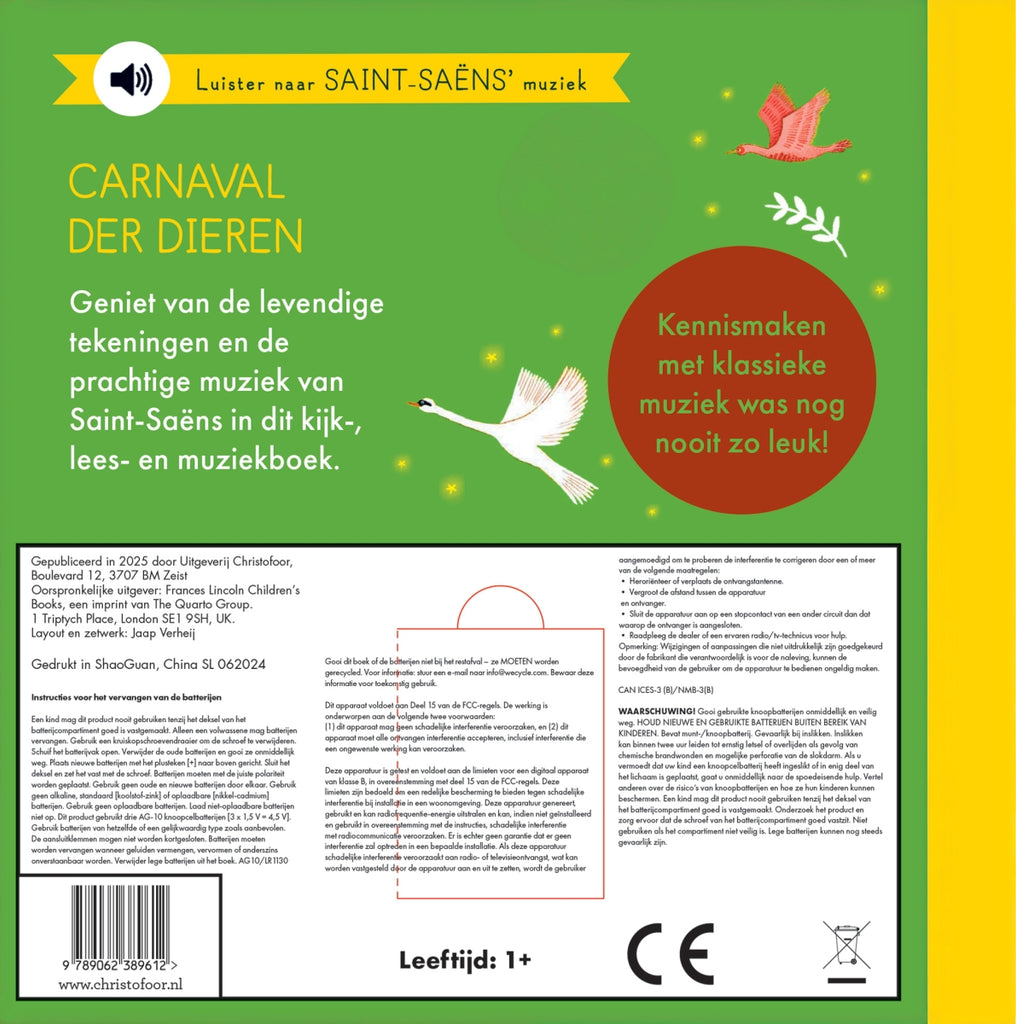 Stevig muziekboekje met kleurrijke illustraties. Druk op de knopjes en luister naar de prachtige muziek van Camille Saint-Saëns. Kennismaken met klassieke muziek was nog nooit zo leuk!